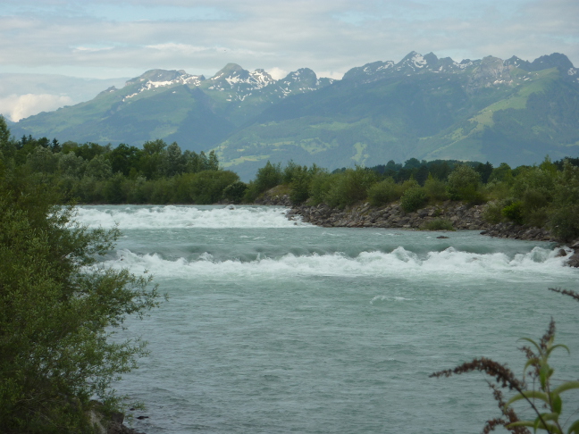 Der Alpenrhein hat sich ein weites Tal geschaffen, aber er ist gezähmt worden. Ein Deich begrenzt sein Bett, das er noch nicht einmal ausfüllt, als ich entlang fahre. Hier ist sicher eine der langweiligen Passagen. Wer genügend Kraft in den Beinen hat, kann sich mit Abstechern in die Berge Abwechslung verschaffen