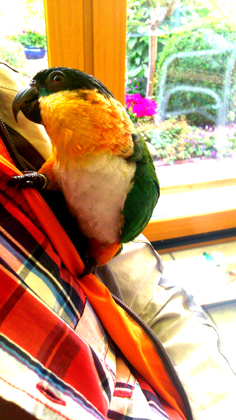 Hier lernte ich am nächsten Morgen nach dem gemeinsamen Frühstück mit meinem Vermieter und seiner Lebensgefährtin "Maxi" kennen, einen drolligen kleinen Papagei, der keine Blondinen mag. Als er aus dem Käfig durfte, kam er gleich zu mir um die Festigkeit meiner Hemdenknöpfe und den Reißverschlus meiner Jacke zu prüfen und auf mir herum zu klettern. Ein goldiger kleiner Kerl.